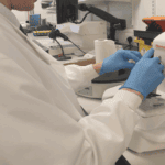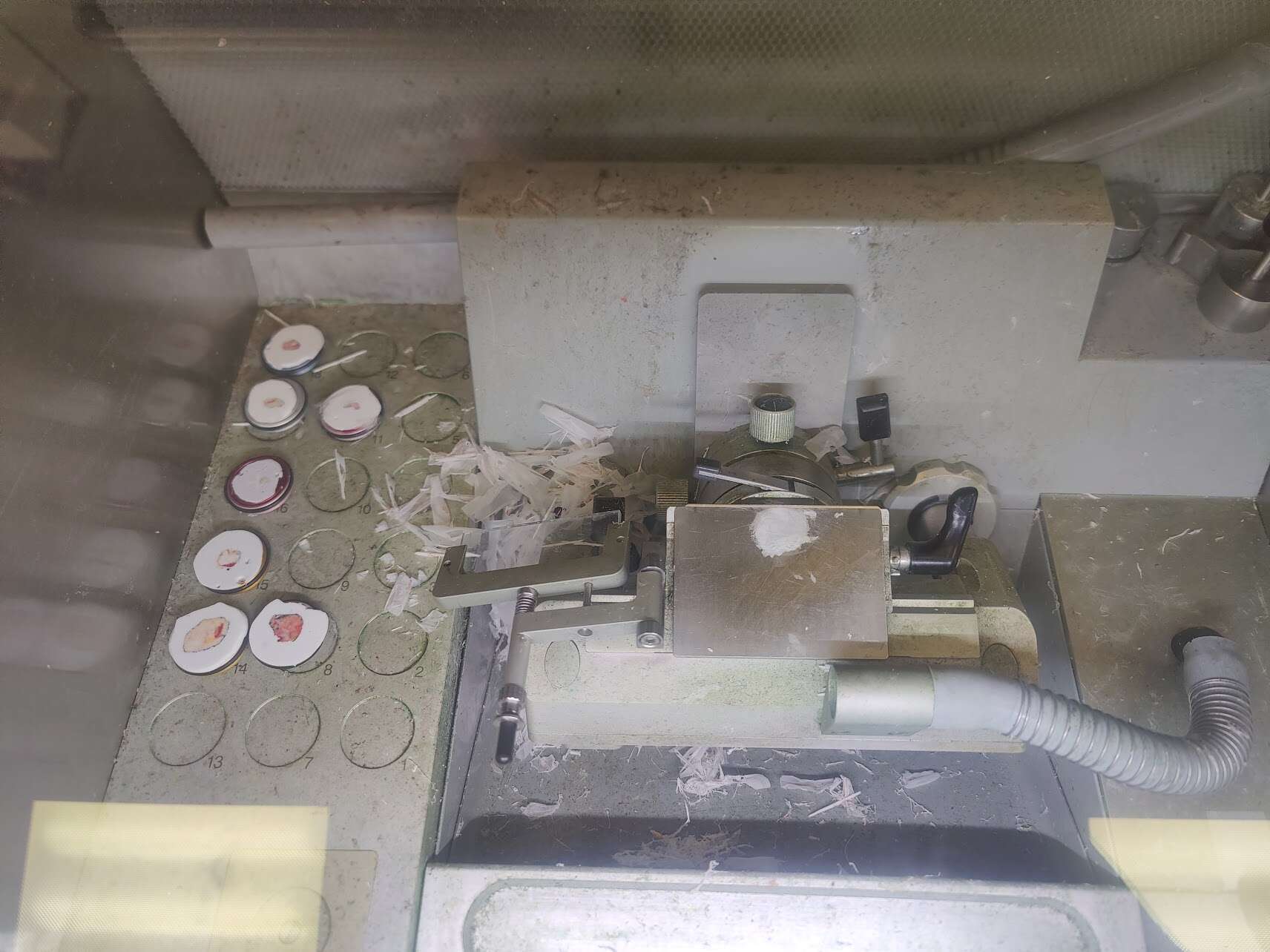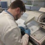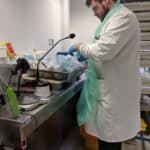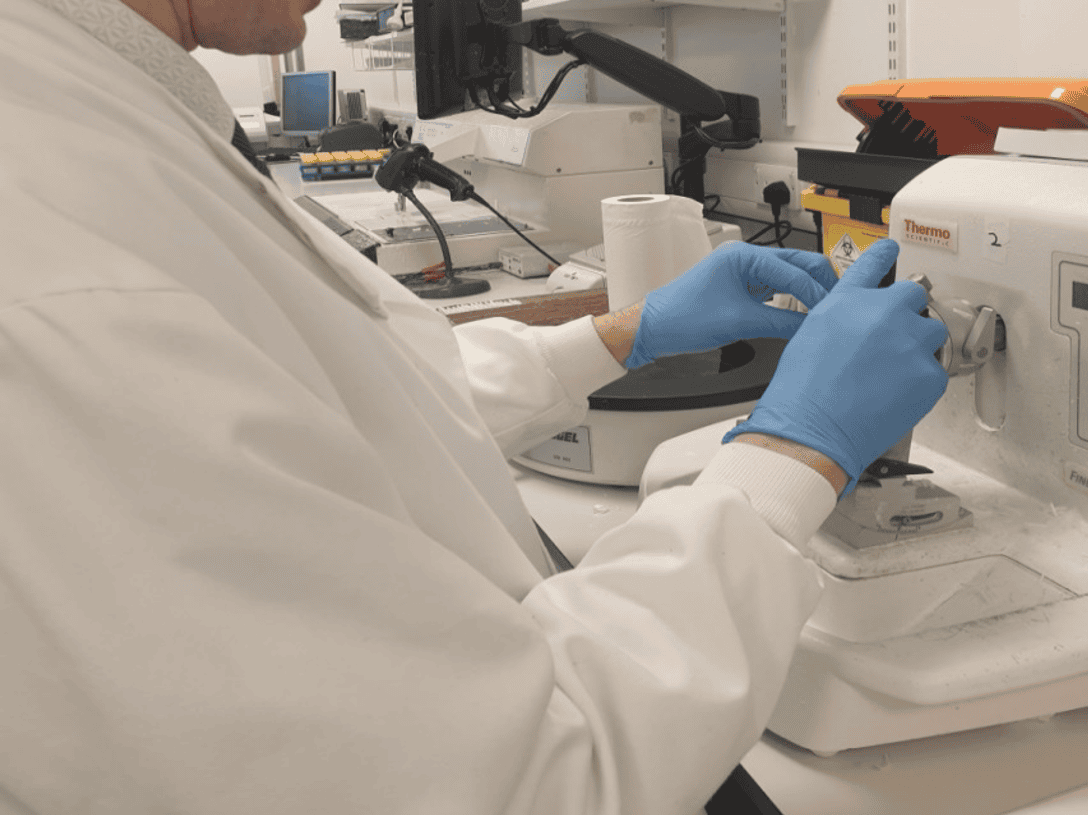 My day involves checking the new samples that have arrived, cutting the samples into thin slices to choose the best parts to test. I then put the samples onto slides and stain them with different colours so the cells can be seen clearly. These are sent to a doctor to look at the cells down a microscope and spot any changes ,like signs of cancer, and identify the best treatment.