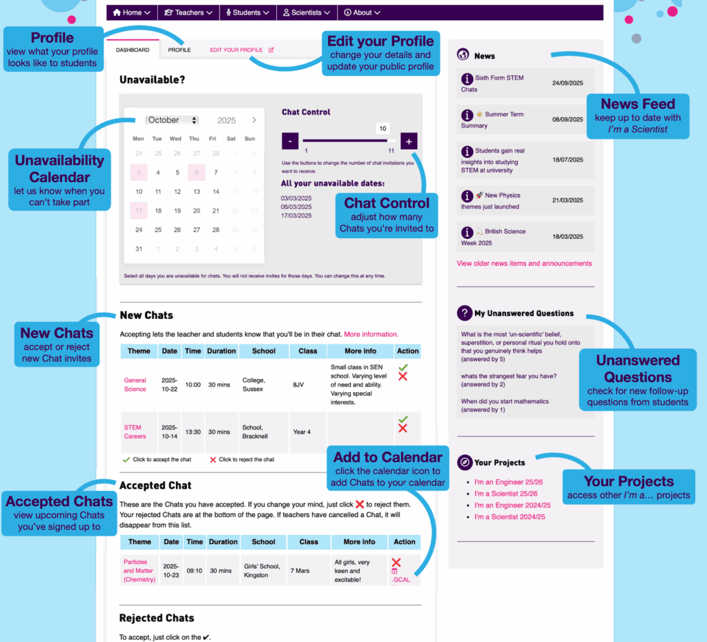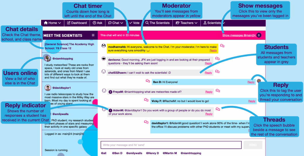 Science-themed Chats take place on I’m a Scientist, engineering-themed on I’m an Engineer, maths-themed on I’m a Mathematician, and computing-themed on I’m a Computer Scientist. Clicking on the Chat link you’re joining from your Dashboard will make sure you’re always in the right place: