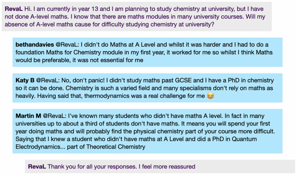 Students from Etone College and The King David High School dropped in to this week’s Chemistry Chat. They asked questions about the elements of university study that mattered the most to them – entry requirements, applications, work experience, volunteering, and which A-levels can help you once you’ve made it onto a chemistry course.